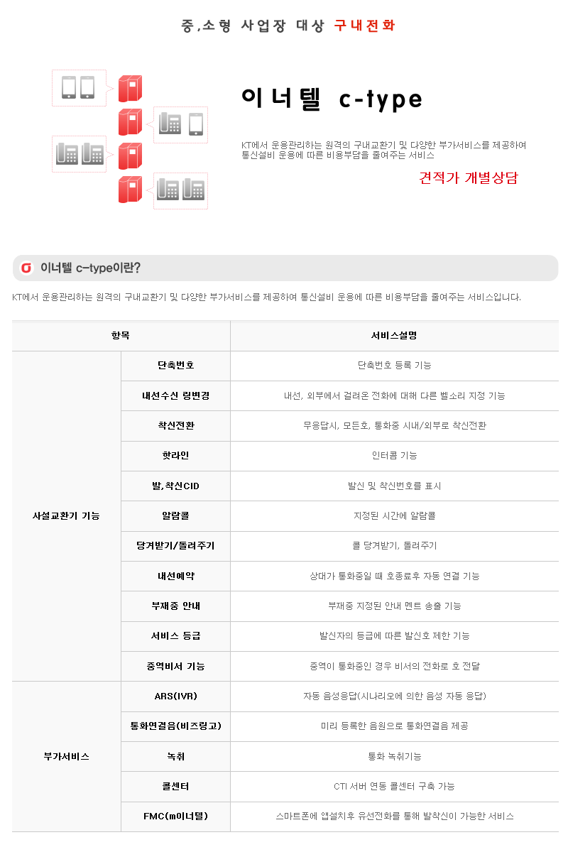 기업전화 인터넷전화인터넷전화 centrex지능형 G/Wcallbox일반전화일반전화무료전화 080이너텔 c-type구내교환 (DID/DOD)ISDN PRI전국대표번호 KT기업인터넷 > 기업전화 > 일반전화 > 이너텔 c-type 이너텔 c-type