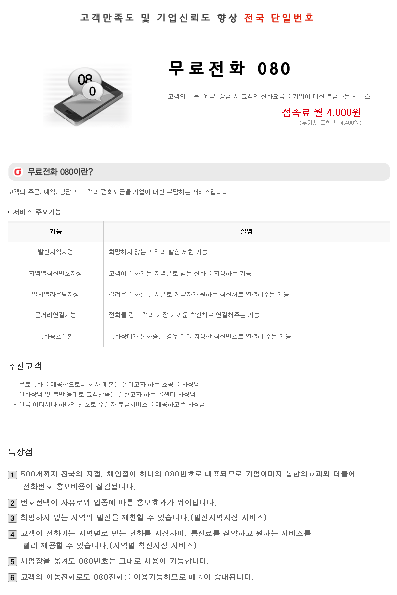 기업전화 인터넷전화인터넷전화 centrex지능형 G/Wcallbox일반전화일반전화무료전화 080이너텔 c-type구내교환 (DID/DOD)ISDN PRI전국대표번호 KT기업인터넷 > 기업전화 > 일반전화 > 무료전화 080 무료전화 080